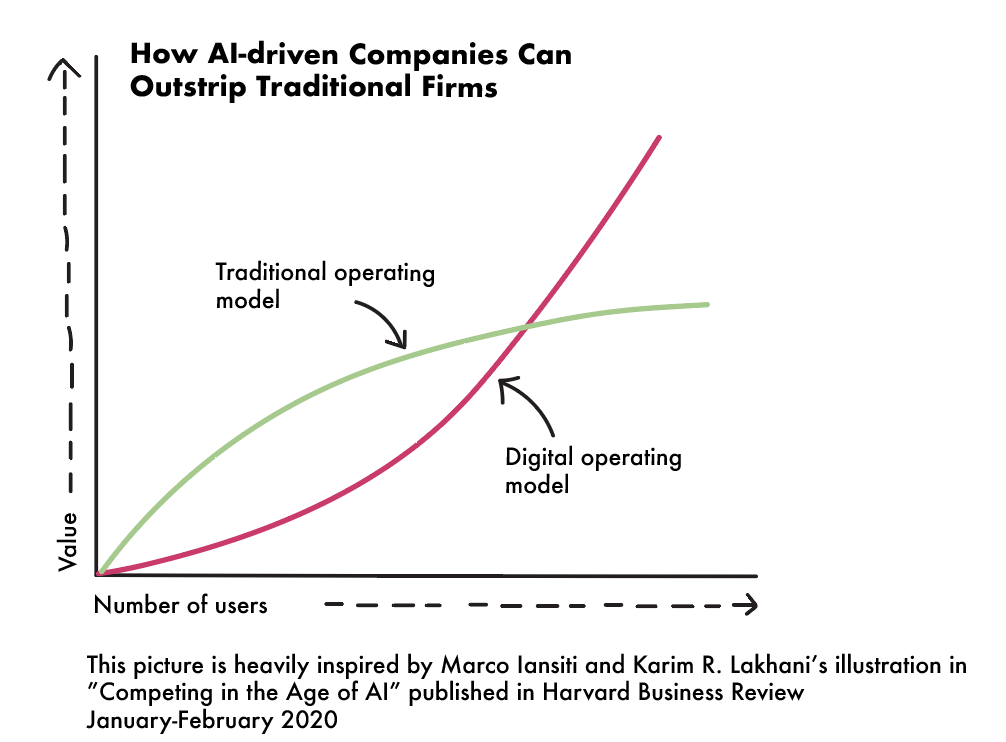 This is exactly the point Iansiti and Lakhani make (see illustration above). In traditional operating models, growth (scale) creates value up to a certain point. As usage increases and the number of customers grows, complexity eventually increases faster than the value generated, which means the effect begins to level off. This quickly leads to additional layers, more administration, and needs of coordination, which in turn result in higher costs and tighter margins.